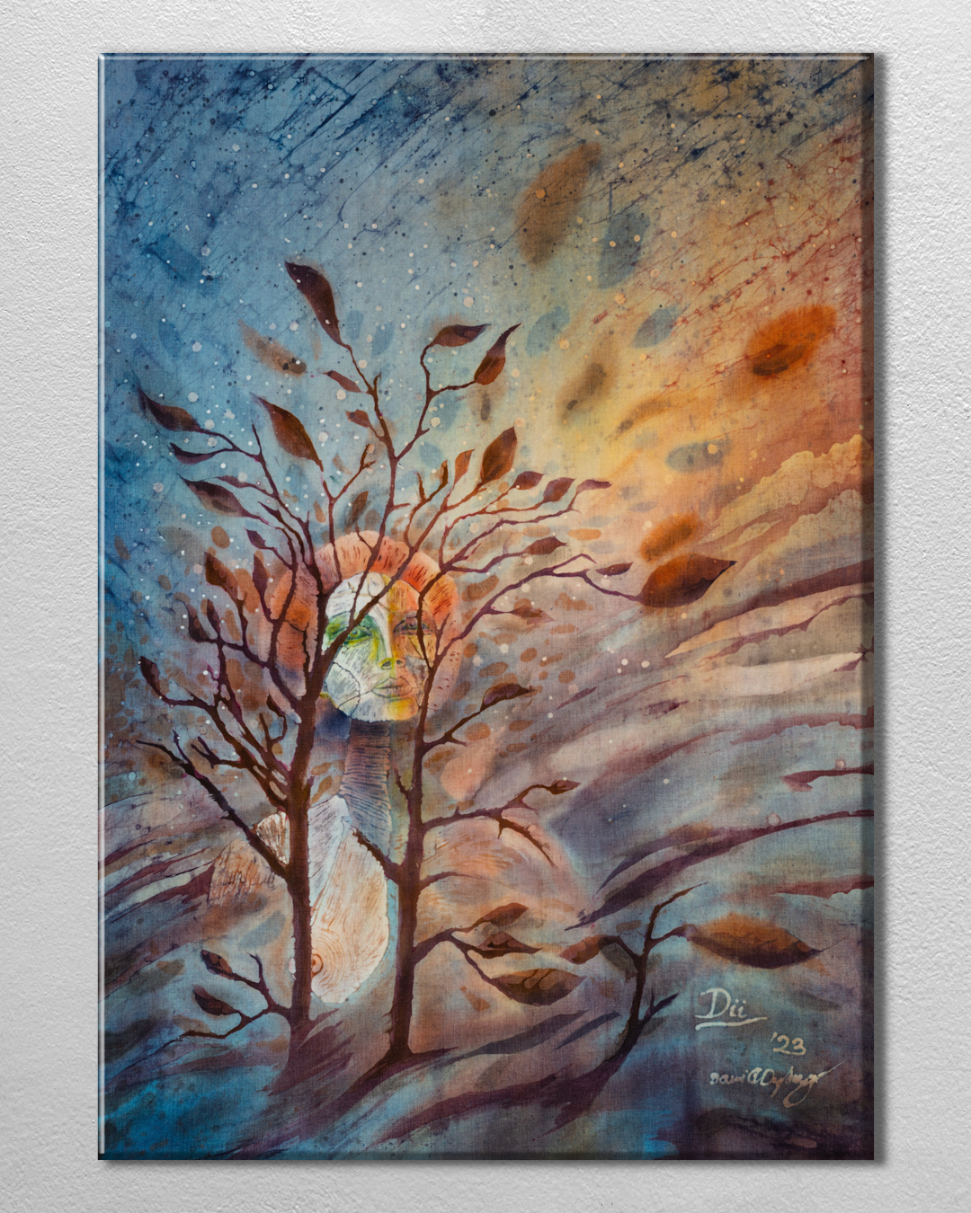 Gałęzie i liście drzew delikatnie przysłaniają tę eteryczną sylwetkę, jakby chroniąc ją przed wzrokiem, dodając kompozycji intymności i tajemnicy. Wokół twarzy widać ciepłą łunę pomarańczowo-czerwonego światła, która kontrastuje z chłodnymi tonami fioletu i purpury. Charakterystyczne spękania techniki batiku na obrzeżach obrazu wprowadzają dodatkową głębię i strukturę, jakby ten sen został zapisany na płótnie.