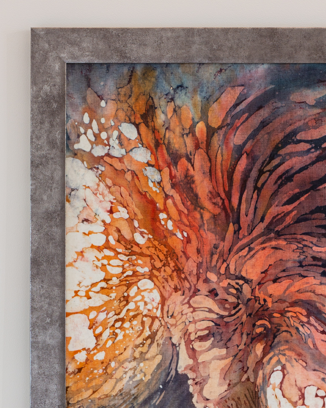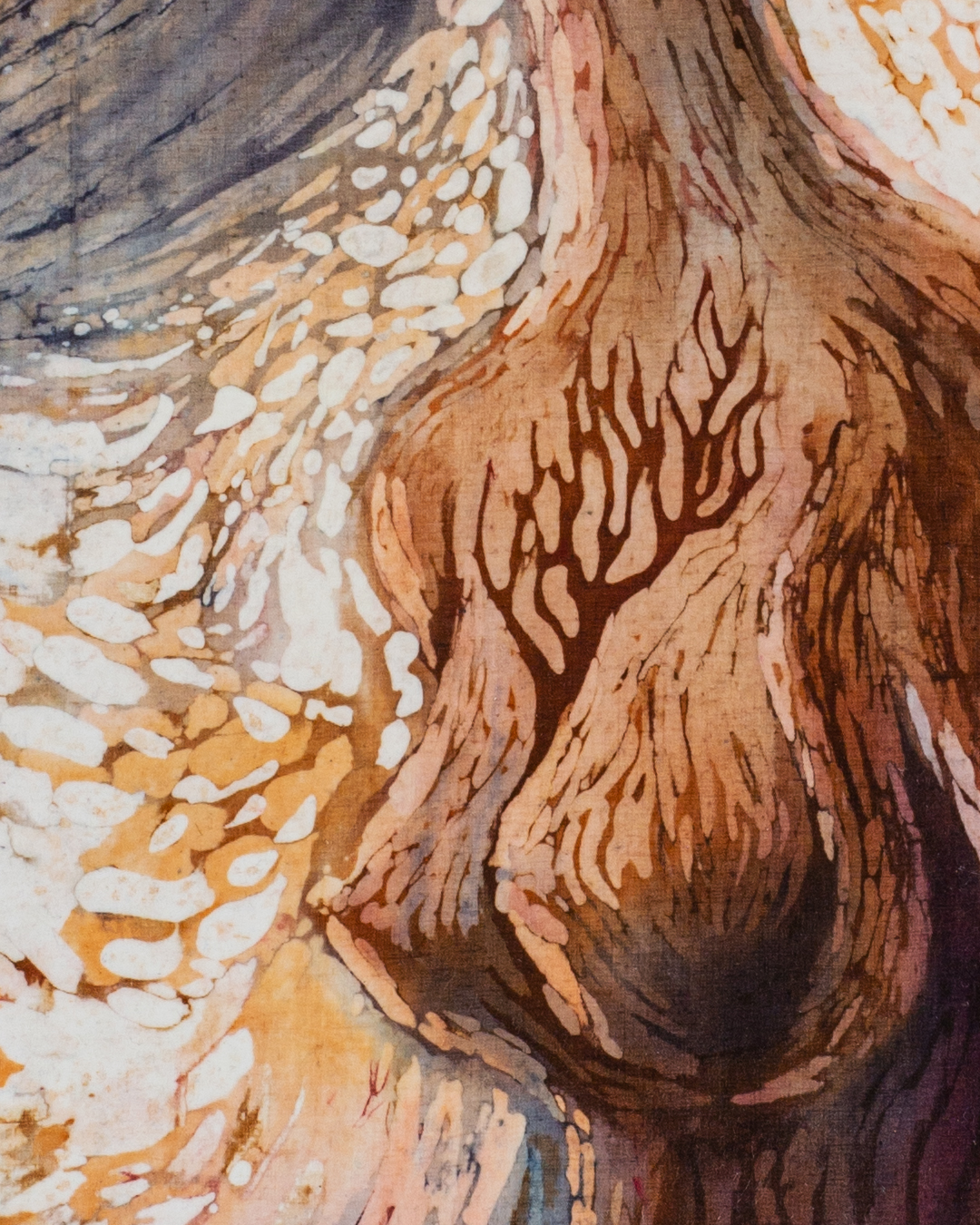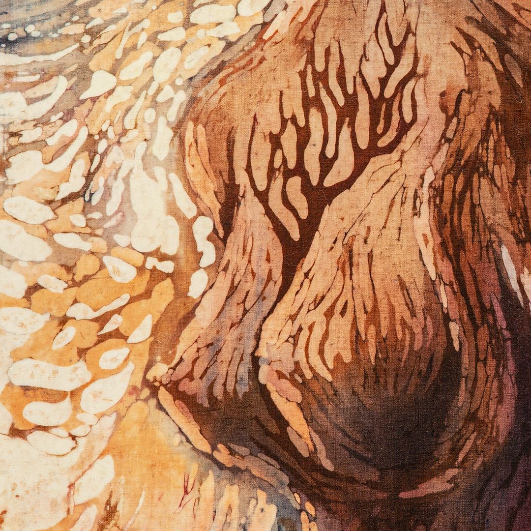 Kolorystyka — ciepłe odcienie pomarańczu, złota, purpury, fioletu i głębokiego indygo — wprowadza intensywność i emocjonalny charakter kompozycji. Obraz zdaje się opowiadać historię o mitycznej sile natury i jej związku z kobiecą esencją, zapraszając widza do snu pełnego tajemnic i legend.