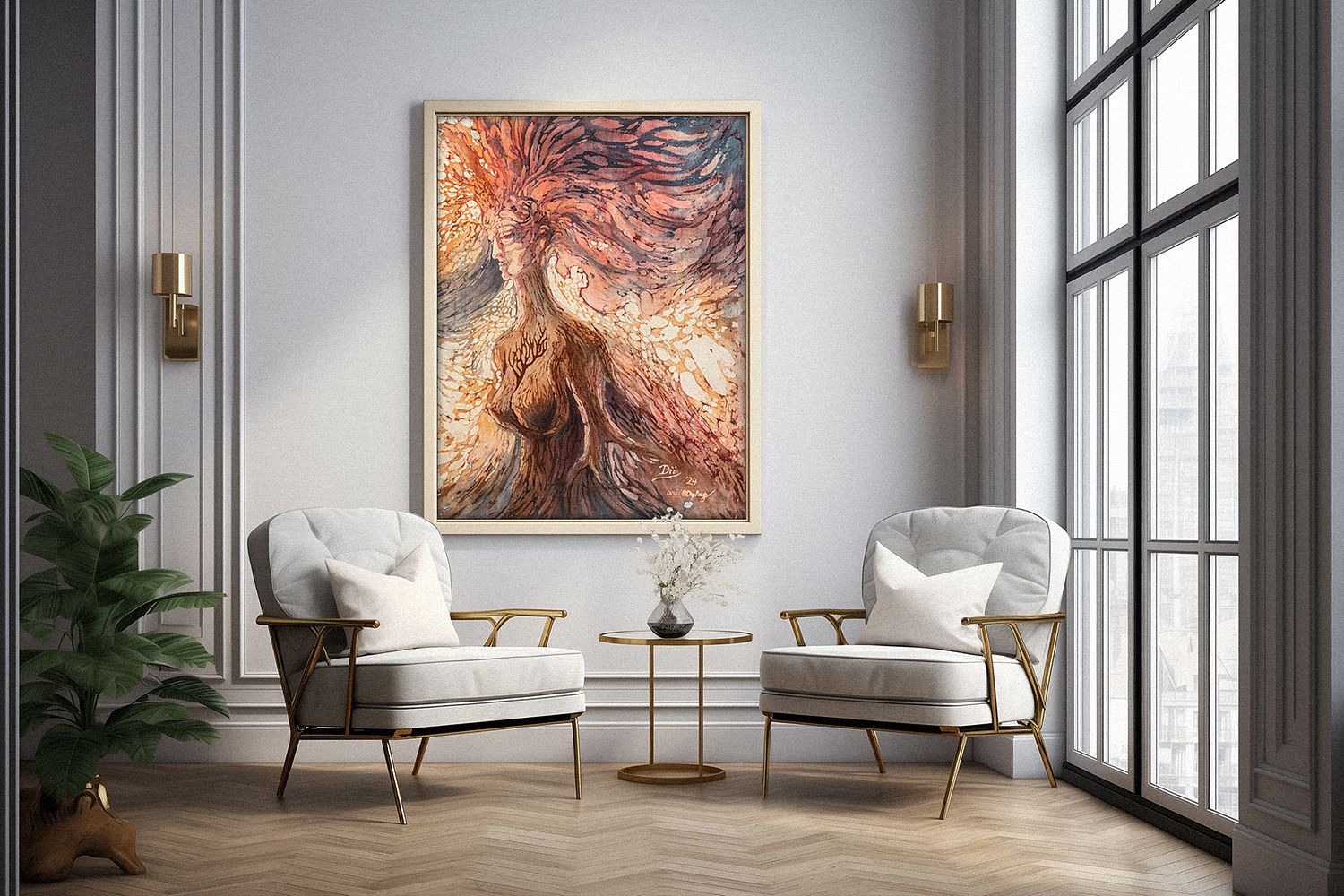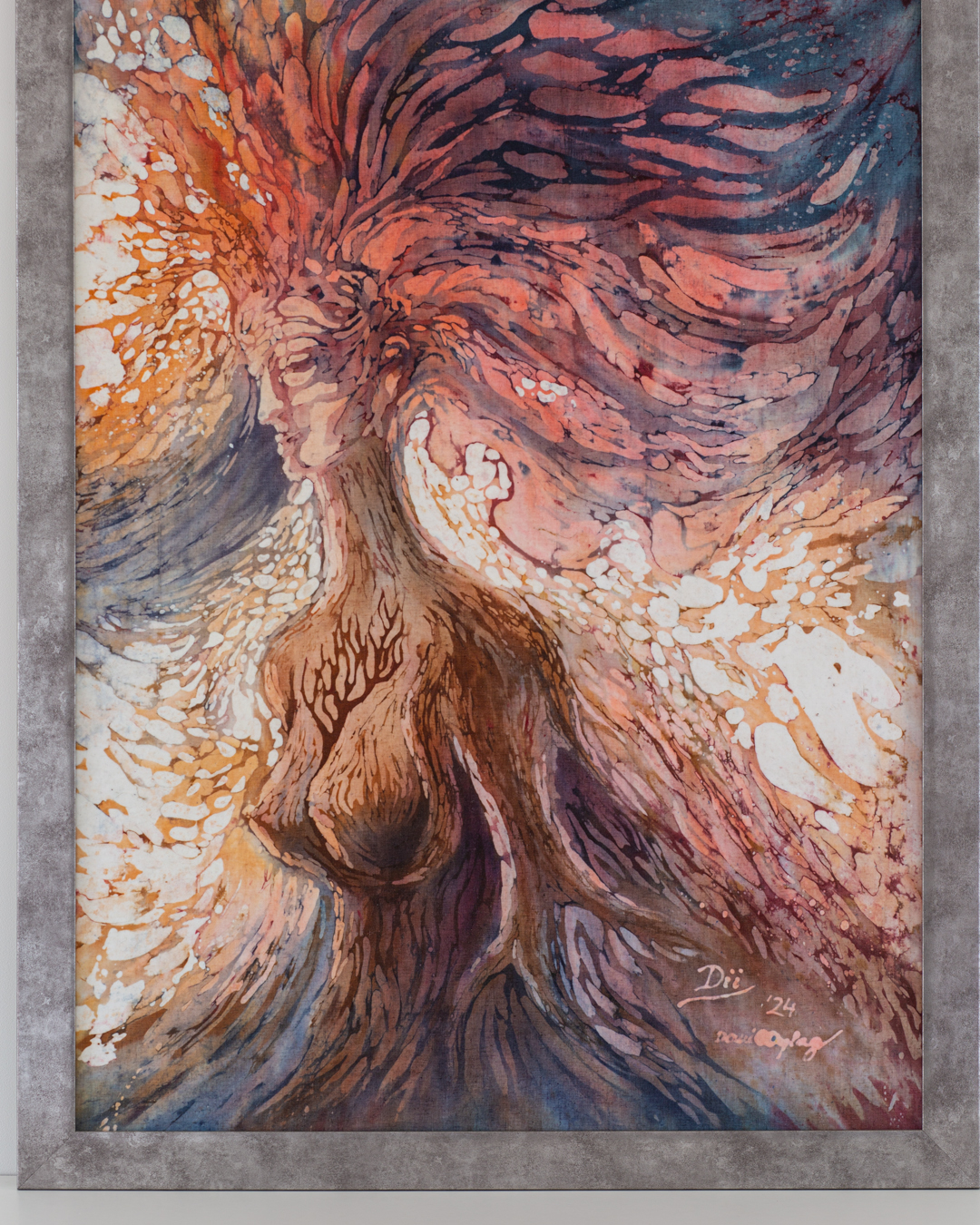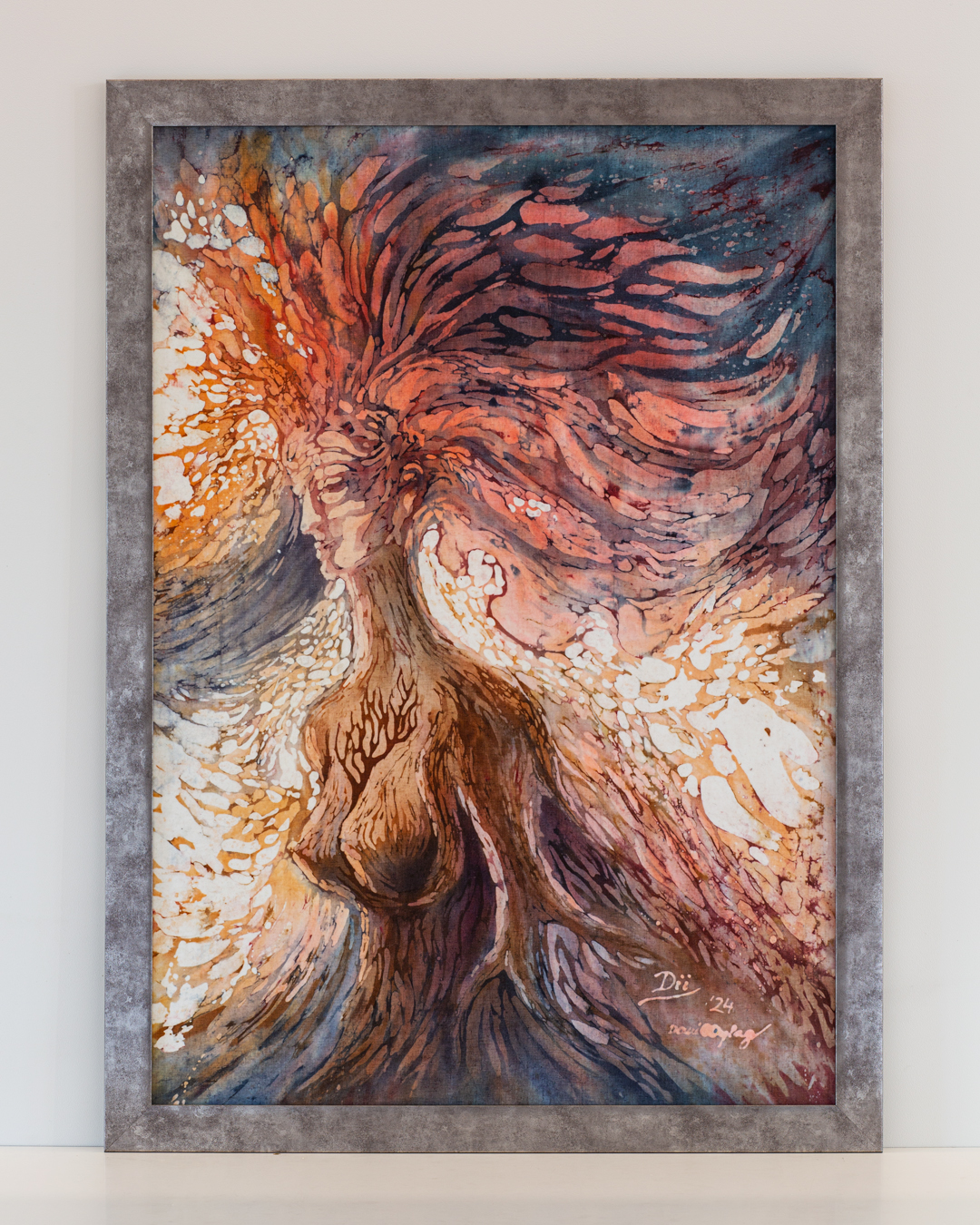 Obraz ukazuje mistyczną postać kobiecą, która zdaje się być jednością z naturą. Jej ciało stapia się z drzewem o bujnej, malowniczej koronie przypominającej rozwiane włosy w odcieniach moreli, złota i purpury. Korzenie drzewa delikatnie oplatają jej sylwetkę, podkreślając subtelne formy kobiecej nagości, widoczne w nieoczywisty sposób. Światło przebija się zza tej leśnej bogini, tworząc aurę tajemnicy i harmonii. Pociągnięcia pędzla nadają obrazowi dynamikę, a plamy barw układają się w fantazyjne wzory, jakby oddawały powiew wiatru.