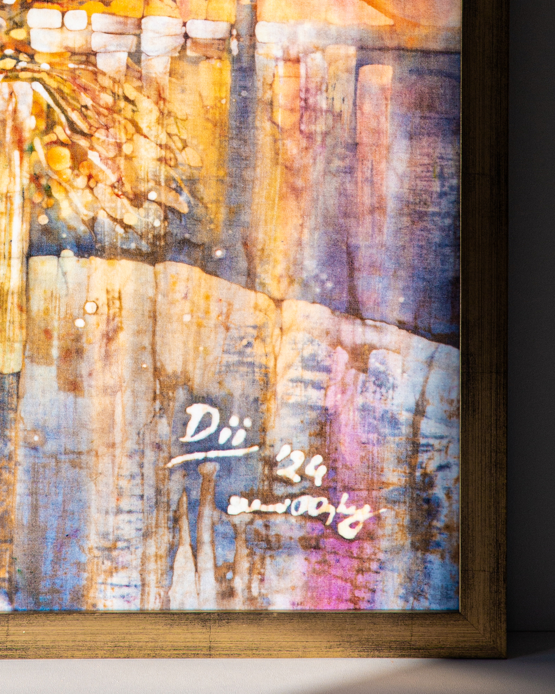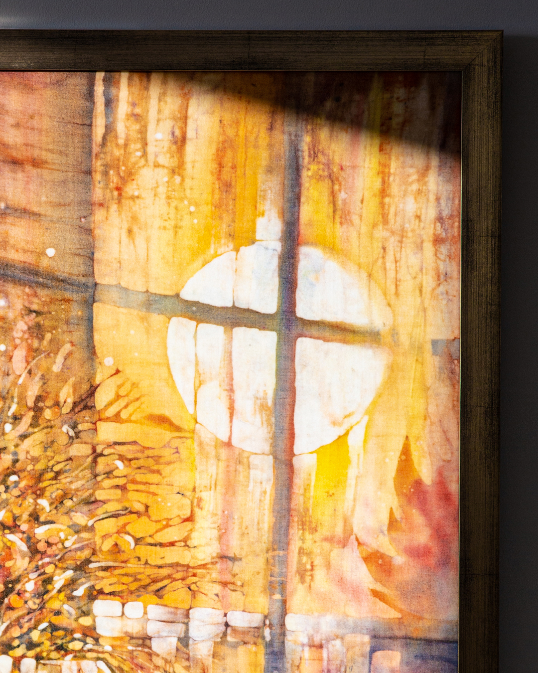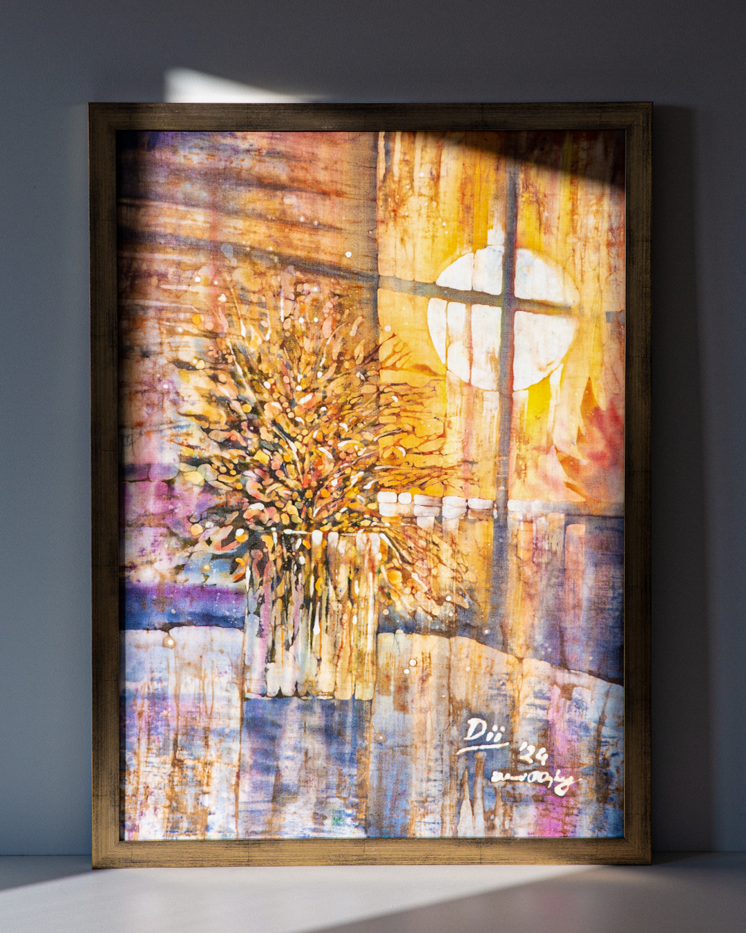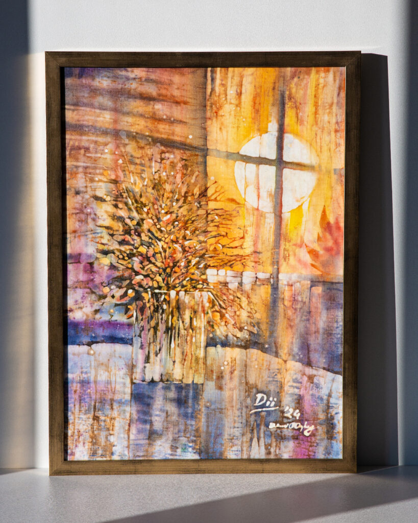 Obraz ukazuje piękną, klasyczną kompozycję – szklany wazon wypełniony kwiatami, stojący w pokoju rozświetlonym złotym światłem słońca. Ciepłe promienie wpadające przez okno tworzą aurę przytulności i spokoju, jednocześnie podkreślając kształty kwiatów, łodyg i liści, które delikatnie lśnią w świetle. W tle obrazu zarysowuje się kształt słońca, które rozlewa swoje ciepło na całą scenę. Szczególną uwagę przyciągają batikowe spękania na powierzchni dzieła, nadające mu wyjątkowej struktury i subtelnej głębi. Przy bliższym spojrzeniu obraz odkrywa bogactwo detali i barw, co sprawia, że jest pełen życia i emocji. Obraz utrzymany jest w ciepłych tonacjach – dominują odcienie żółci, złota, ciepłego pomarańczu i rudego. W kontraście do nich pojawiają się głębokie, spokojne cienie w odcieniach fioletu, granatu, ciemnej zieleni i indygo, które dodają kompozycji harmonii i wyważenia.