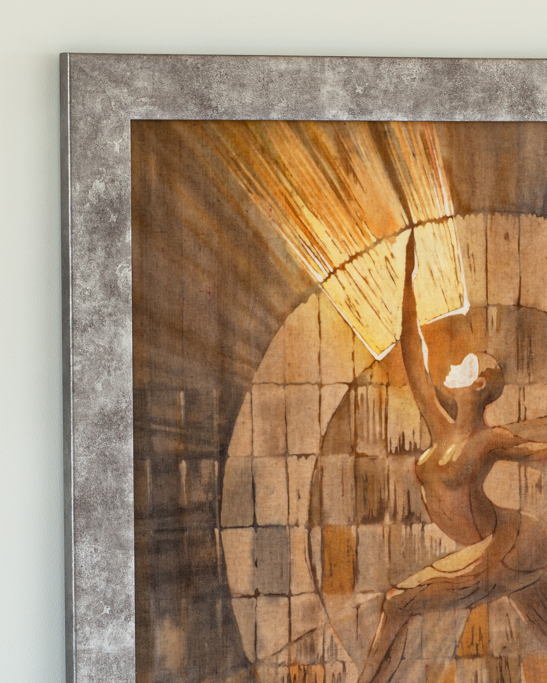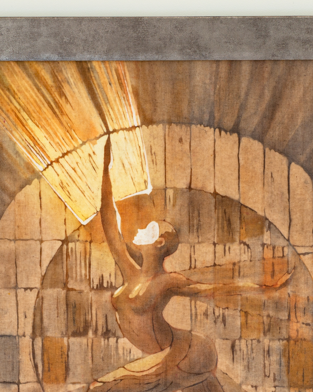 Obraz ukazuje dynamiczną postać kobiecą, uchwyconą w ekspresyjnej pozie. Jedna noga wyciągnięta do przodu, druga w tył – całość sugeruje ruch, moc i siłę. Jedna ręka wzniesiona w górę, ku bijącemu z góry światłu, druga podkreśla ekspresję całej sylwetki. To światło – czy może właśnie świetlista twarz postaci – staje się źródłem energii, która wypełnia cały obraz.