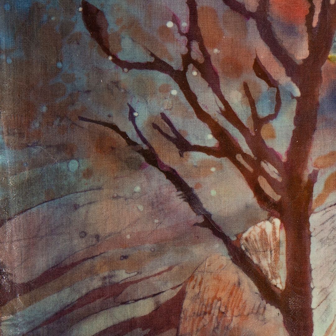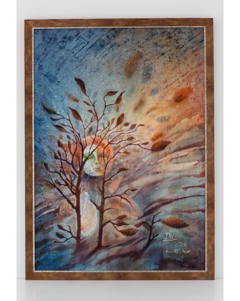 Gałęzie i liście drzew delikatnie przysłaniają tę eteryczną sylwetkę, jakby chroniąc ją przed wzrokiem, dodając kompozycji intymności i tajemnicy. Wokół twarzy widać ciepłą łunę pomarańczowo-czerwonego światła, która kontrastuje z chłodnymi tonami fioletu i purpury. Charakterystyczne spękania techniki batiku na obrzeżach obrazu wprowadzają dodatkową głębię i strukturę, jakby ten sen został zapisany na płótnie.