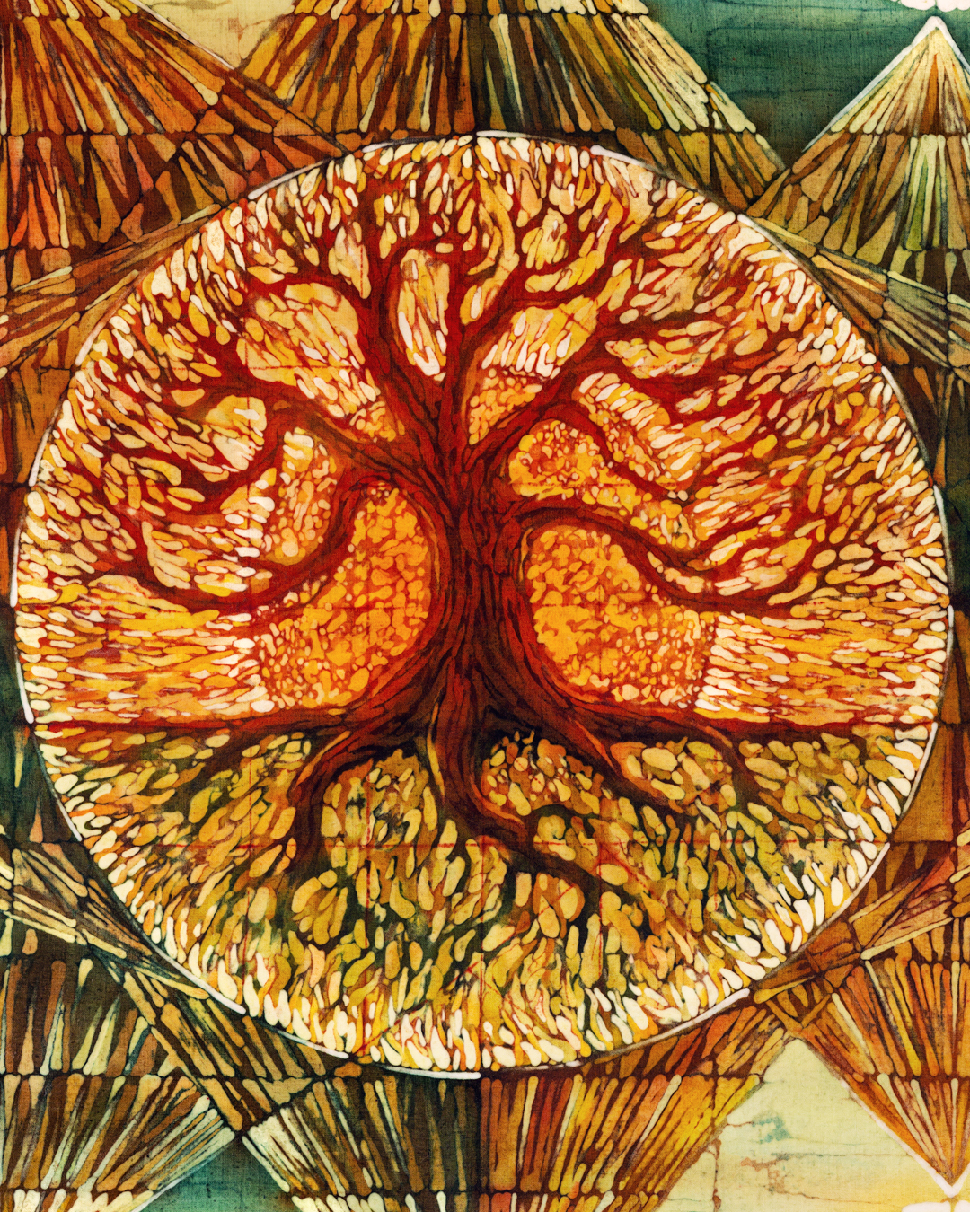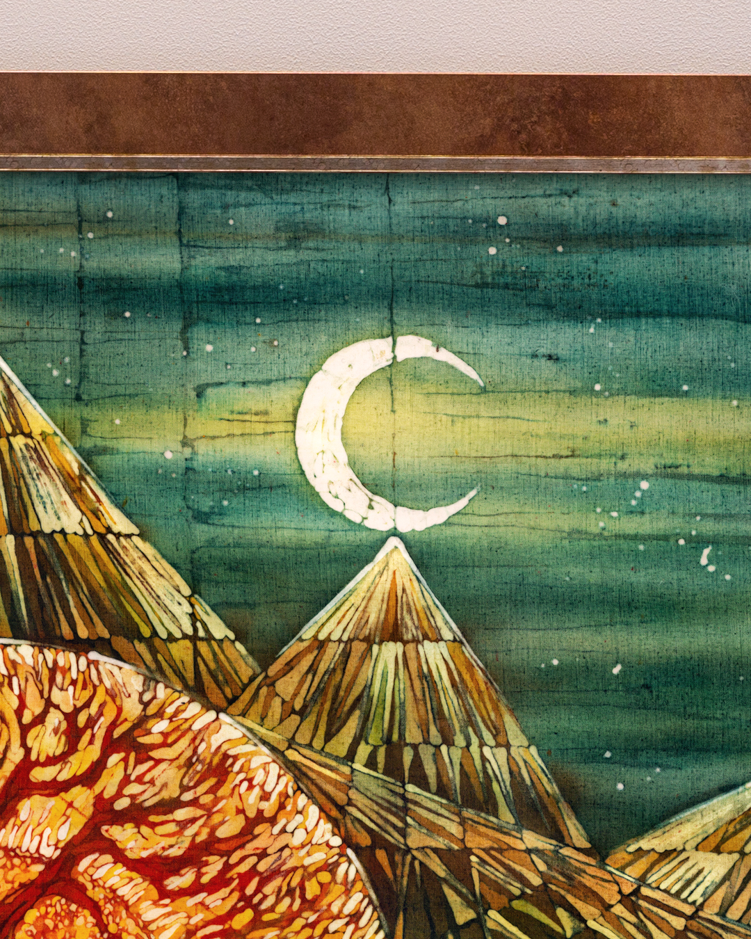 Barwy – od chłodnych tonów granatu i purpury, po ciepłe akcenty złota i pomarańczy – doskonale się dopełniają, przywołując zarówno tajemniczość kosmosu, jak i ciepło naturalnych krajobrazów. Subtelne spękania techniki batiku wprowadzają warstwowość i wzmacniają wrażenie, że obraz jest nie tylko wizualnym dziełem, ale również symboliczną opowieścią o przenikaniu różnych światów.